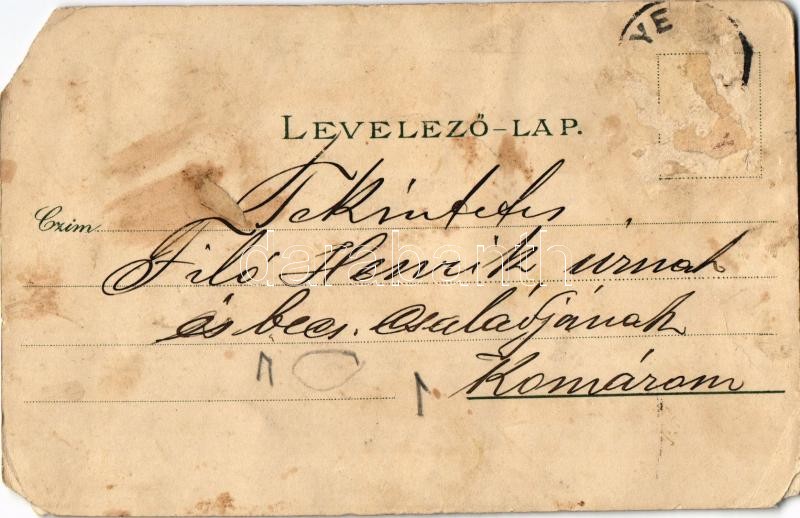 ~1900 (Vorläufer) Privigye, Prievidza; Erzsébet tér, gimnázium, Mária templom, Fő tér, vendéglő / square, school, church, restaurant. Art Nouveau, floral, litho (EM)