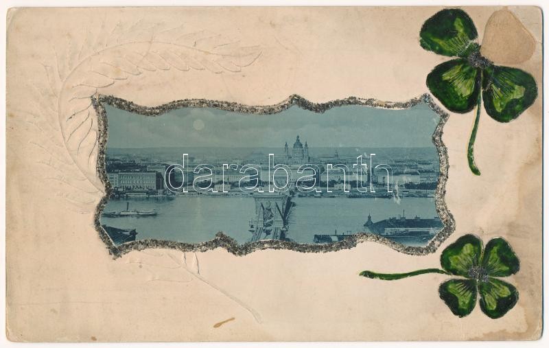 Beschreibung: ~1899 (Vorläufer) Budapest, Lánchíd, Bazilika. Díszített óriás levelezőlap (21,5 x 13,5 cm) (felszíni sérülés / surface damage)
