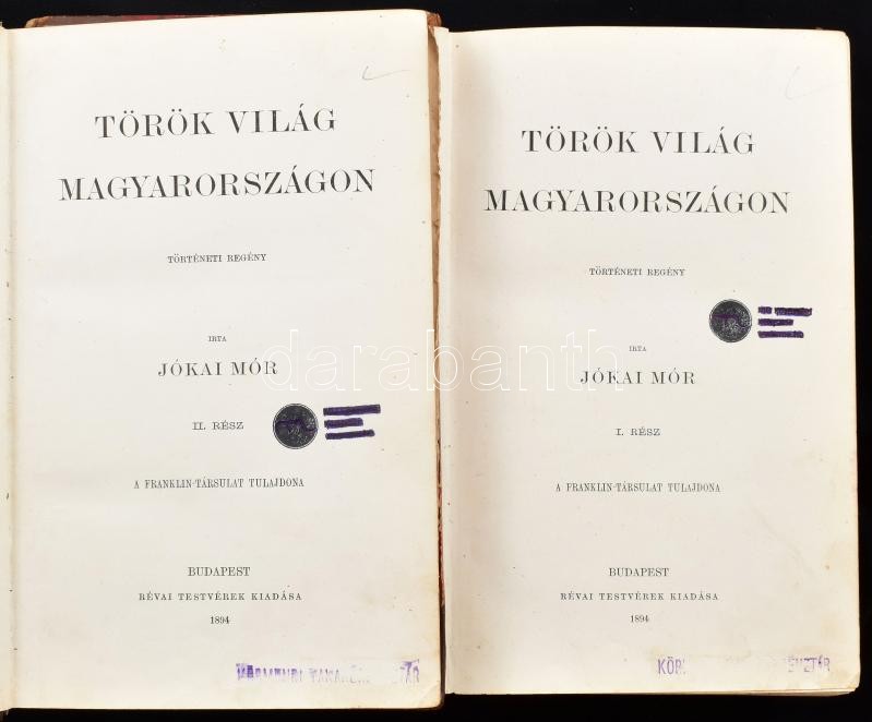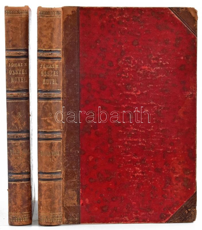 Jókai Mór: Török világ Magyarországon. I-II. köt. Jókai Mór összes művei. Bp., 1894, Révai. Aranyozott gerincű félbőr kötés, újrakötött. Kopott borító, a széleken szakadozott. laza kötés.