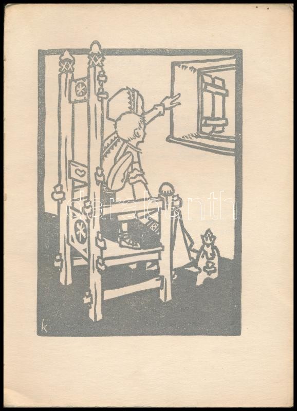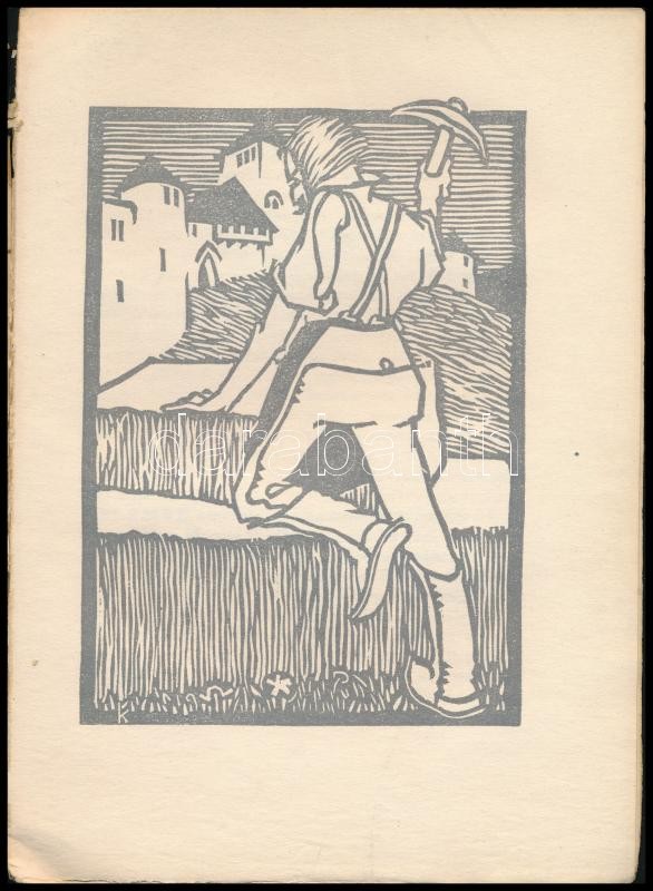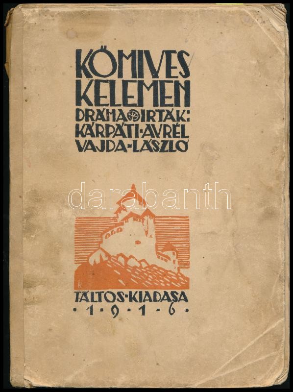 Kárpáti Aurél-Vajda László: Kőmíves Kelemen. Dráma. Bp., 1916., Táltos, 102 p.. A lapszámozáson belül Kós Károly (1883-1977) 4 egészoldalas linómetszetével. Kiadói papírkötésben, foltos, sérült borítóval, sérült, javított gerinccel és kötéssel, lapok sarkain szamárfülekkel. Számozott (487/500) példány