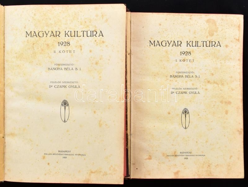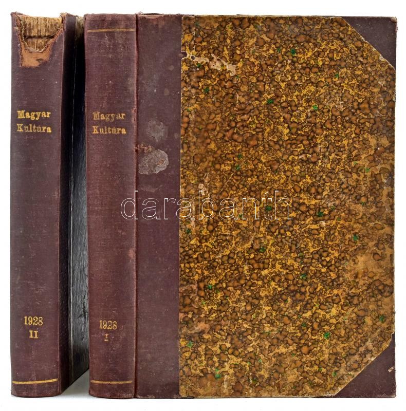 Magyar Kultúra 1928. I-II. köt. Főszerk.: Bangha Béla. Bp., 1928, Pallas-ny., IV+576 p., (4)+544 p. Félvászon-kötésben, festett lapélekkel, kissé kopott borítóval, sérült gerinccel, helyenként foltos lapokkal.