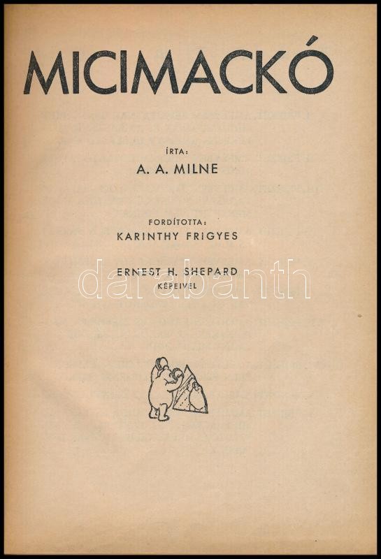 [Milne, Alan Alexander] A. A. Milne: Micimackó. Ford.: Karinthy Frigyes. Ernes H. Shepard képeivel. Bp., [1957], Kossuth (Athenaeum-ny.), 123 p. Szövegközi és egészoldalas, fekete-fehér illusztrációkkal. Kiadói félvászon-kötés, kissé sérült borítóval.