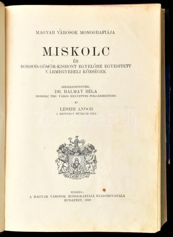 Miskolc. Szerk.: Dr. Halmay Béla és Leszih Andor. Magyar Városok Monográfiája V. Bp., 1929., Magyar Városok Monografiája Kiadóhivatala, (Wodianer F. és Fiai-ny.). Szövegközti fekete-fehér illusztrációkkal. Kiadói aranyozott egészvászon-kötés, kopott borítóval, javított gerinccel és kötéssel, aláhúzásokkal. Volt könyvtári példány.