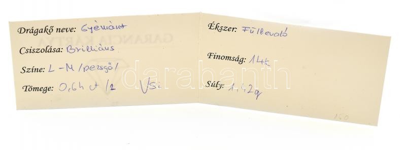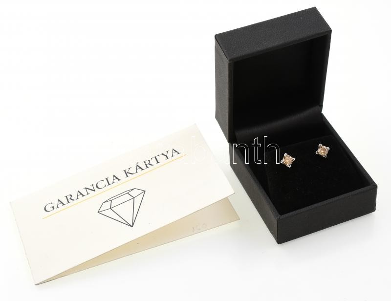 Beschreibung: Arany (14k/Au) Fülbevaló, fehérarany, pezsgő színű gyémánttal ékítve, (0,64ct), Bruttó: 1,42g, jelzett. Garancia kártyával!