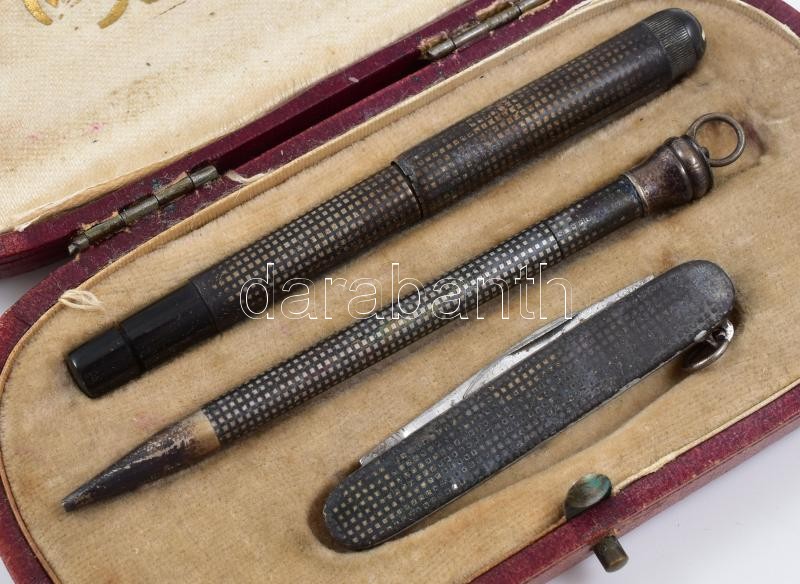 Beschreibung: Ezüst (Ag) úti írószerszám és bicska készlet. Niellós, saját dobozában. Jelzett, bruttó: 31 g