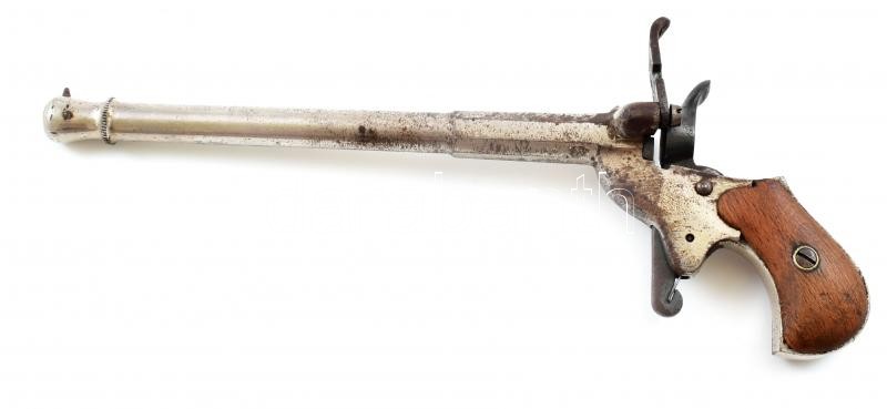 Beschreibung: 19. századi 6 mm-es Flobert pisztoly, BB sapka (Bulleted Breech Cap), Feltalálta Louis-Nicolas Flobert 1845-ben, amelyet beltéri céllövészethez terveztek. kopott. h: 20 cm