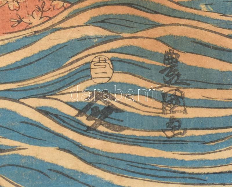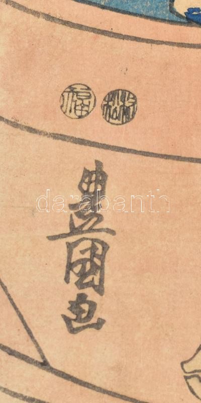 Japán fametszet, Triptichon - Utagawa Kunisada (1786-1865) - Színészek: Suketakaya Takasuke III, Iwai Kumesaburô III és Arashi Kichisaburô III- Japán - 1853. Sérült, jelzett, 74x36,5 cm