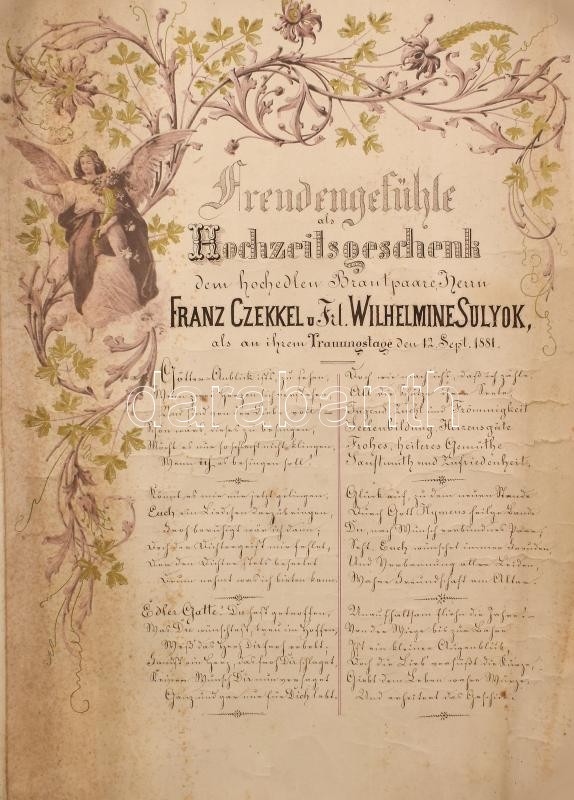 1881 Díszes házassági oklevél Czekel Ferenc és Sulyok Wilhelmina házas... https://www.darabanth.com/de/418-Fernauktion/418.0/Kunst-Dokumente-andere-Sammelgebiete/Dokument~500018/1881-Diszes-hazassagi-oklevel-Czekel-Ferenc-es-Sulyok-Wilhelmina-hazassagara-Kezzel-rajzol~II2641252