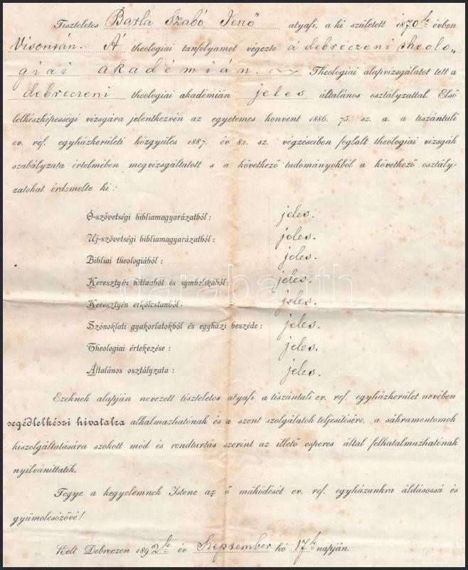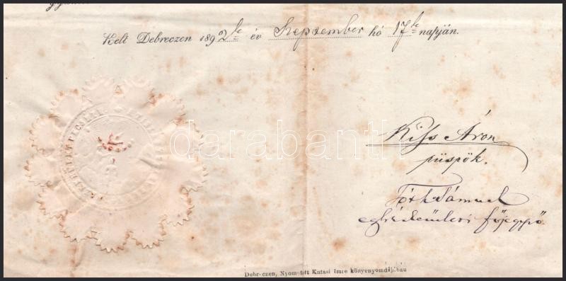 1892 Debreceni teológia akadémia bizonyítványa Kiss Áron püspök autogr... https://www.darabanth.com/de/418-Fernauktion/418.0/Kunst-Dokumente-andere-Sammelgebiete/Dokument~500018/1892-Debreceni-teologia-akademia-bizonyitvanya-Kiss-Aron-puspok-autograf-alairasaval~II2634687