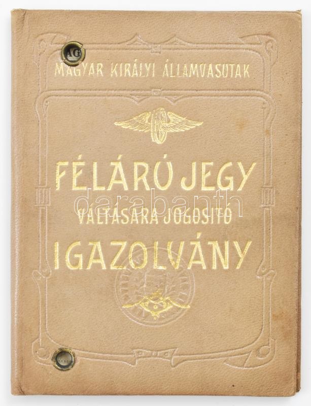Beschreibung: 1912 Réthi Lajos nyug. kir. tanácsos fényképes félárú jegy váltására jogosító igazolvány, aranyozott egészbőr-kötésben
