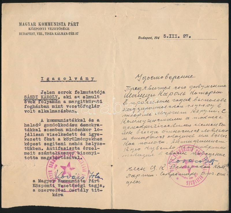 1945 Igazolás Sásdi Károly részére Kovács István (1911-2011) aláírásáv... https://www.darabanth.com/de/418-Fernauktion/418.0/Kunst-Dokumente-andere-Sammelgebiete/Dokument~500018/1945-Igazolas-Sasdi-Karoly-reszere-Kovacs-Istvan-1911-2011-alairasaval~II2637231