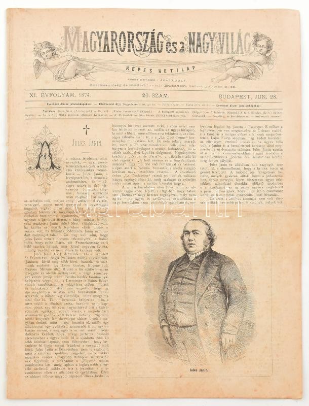 1874 Magyarország és a Nagyvilág, képes hetilap, 1 száma, felelős szerkesztő: Ágai Adolf. Többek közt a budapesti Népszínház illusztrációjával és Porzó, azaz Ágai Adolf tárcájával, 12p, kissé sérült és foltos, 39x29 cm