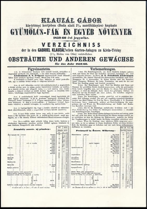 Klauzál Gábor kis-tétényi kertjében kapható gyümölcs-fák és egyéb növé... https://www.darabanth.com/de/418-Fernauktion/418.0/Kunst-Dokumente-andere-Sammelgebiete/Drucksachen~1000002/Klauzal-Gabor-kis-tetenyi-kertjeben-kaphato-gyumolcs-fak-es-egyeb-novenyek-185960-ev~II2635400