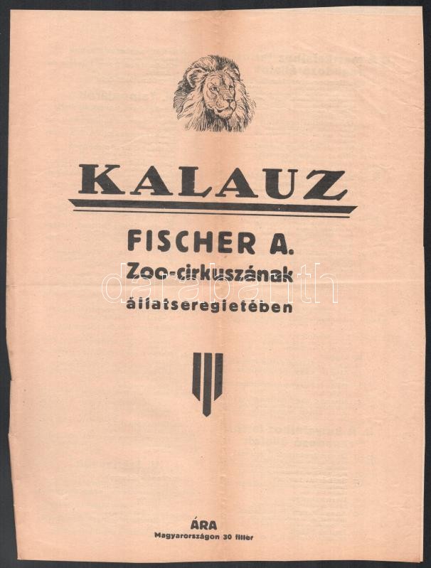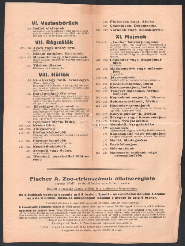 cca 1910 Kalauz Fischer A. zoo-cirkuszának állatseregletében.. Állatke... https://www.darabanth.com/de/418-Fernauktion/418.0/Kunst-Dokumente-andere-Sammelgebiete/Drucksachen~1000002/cca-1910-Kalauz-Fischer-A-zoo-cirkuszanak-allatseregleteben-Allatkerti-allatok-felsorolasa~II2641606