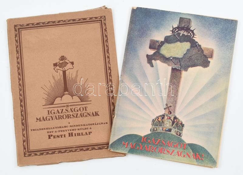 cca 1925 Igazságot Magyarországnak! Trianon kegyetlen tévedései. A Pesti Hírlap ötvenéves fennállása alkalmából. Szerk.: Légrády Ottó. Irrendenta kiadvány, gazdag képanyaggal, térképekkel, érdekes írásokkal. 150 p. Tűzött papírkötés, kissé sérült, levált borítóval, eredeti, kissé sérült, illusztrált karton tokban.