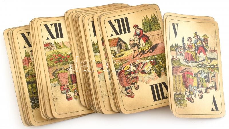 Beschreibung: cca 1930 Régi magyar tarokk kártyák, össz. 42 lap, kopott, 12,5x7,5 cm