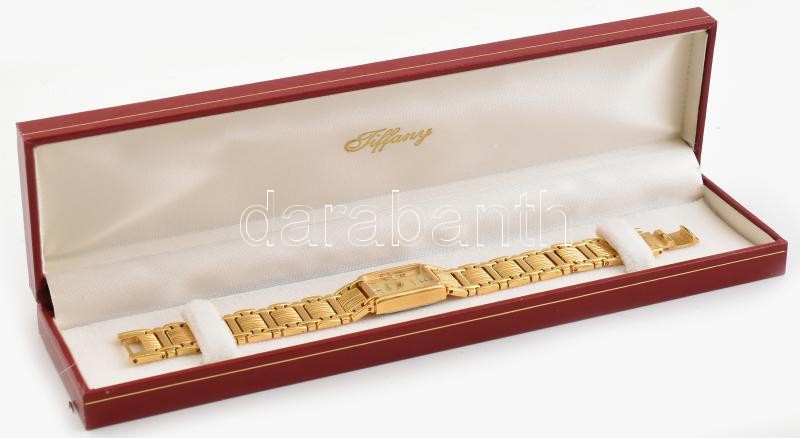 Beschreibung: Tiffany aranyozott női kvarc karóra, fém szíjjal, újszerű, szép állapotban, eredeti bőr díszdobozban, 23x11 mm