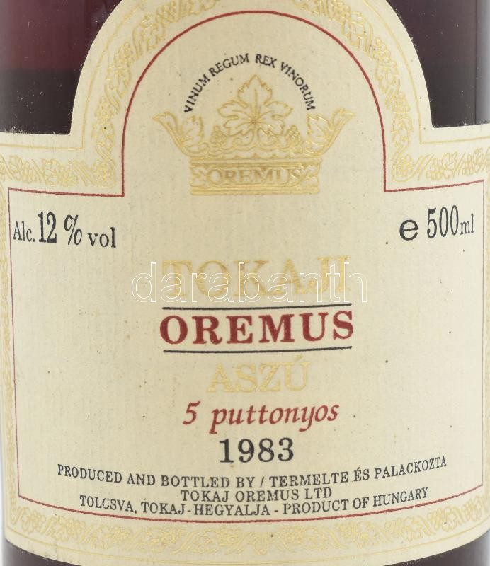 1983 Oremus 5 puttonyos tokaji aszú, bontatlan palack, 0,5 l. Pincében... https://www.darabanth.com/de/418-Fernauktion/418.0/Kunst-Dokumente-andere-Sammelgebiete/Vintage-Weine-Getranke~500015/1983-Oremus-5-puttonyos-tokaji-aszu-bontatlan-palack-0-5-l-Pinceben-szakszeruen-tarolt~II2634408