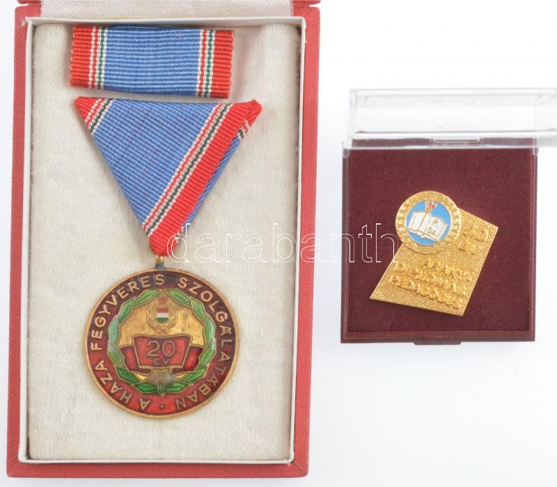Beschreibung: ~1970-1980. "Aranydiplomás Pedagógus 50 év" zománcozott fém jelvény + 1965. "Szolgálati Érdemérem - A Haza Fegyveres Szolgálatában 20 év" zománcozott kitüntetés mellszalagon, szalagsávval, tokban T:1-