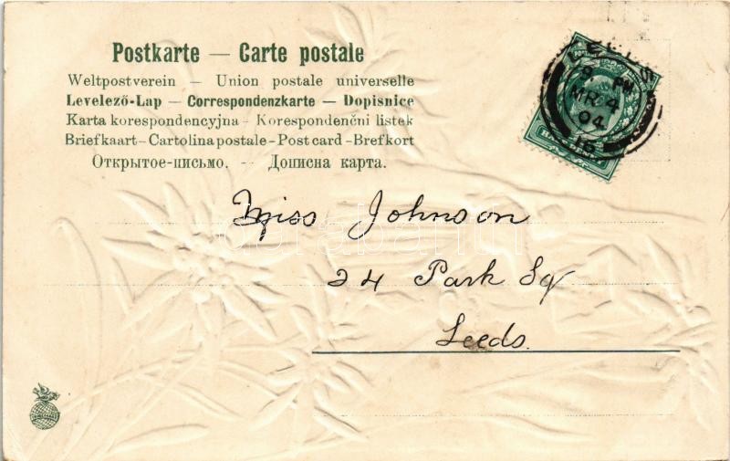 Beschreibung: 1904 Highlander folklore art postcard with lady. Art Nouveau, floral, Emb. litho with real silk (EK)