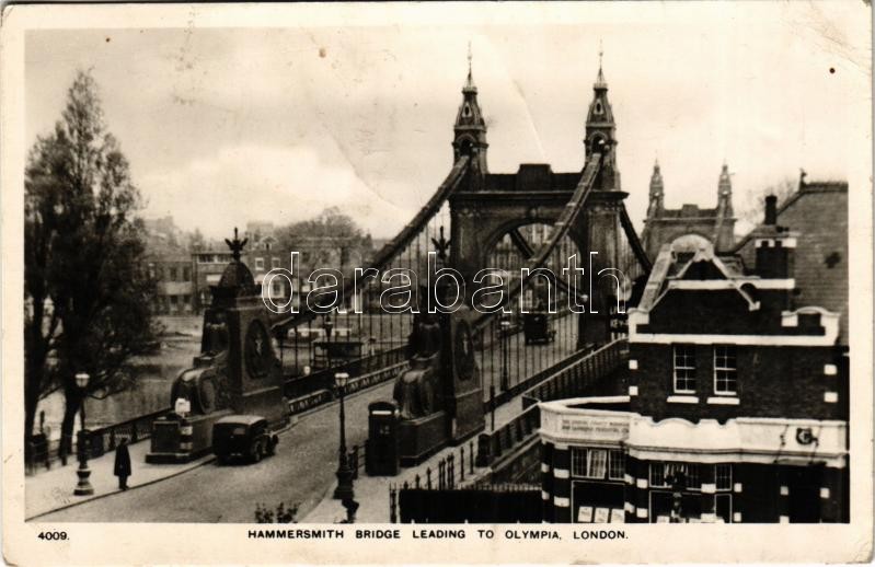 1956 London, Hammersmith Bridge leading to Olympia (EK) https://www.darabanth.com/de/419-Fernauktion/419.0/Ansichtskarten/GroC39Fbritannien~1500114/1956-London-Hammersmith-Bridge-leading-to-Olympia-EK~II2650866