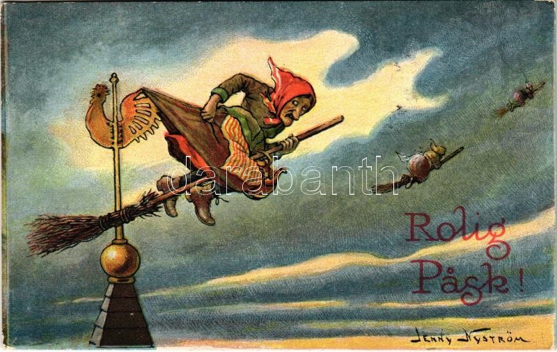 Beschreibung: 1919 Rolig Pask! / Svéd húsvéti üdvözlet boszorkánnyal / Swedish Easter greeting with witch. Axel Eliassons No. 6160. s: Jenny Nyström