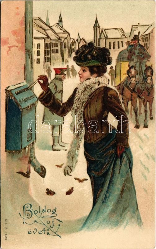 Beschreibung: Boldog Újévet! / New Year greeting art postcard with lady. Emb. litho (lyuk / pinhole)