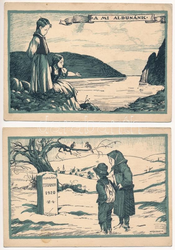 Beschreibung: 2 db RÉGI magyar irredenta képeslap Márton L. rajzaival. A Magyar Nemzeti Szövetség kiadása / 2 pre-1945 Hungarian irredenta art postcards