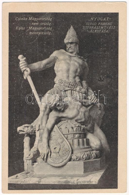 Budapest V. Szabadság tér, Trianon szoborcsoport, irredenta propaganda. "Nyugat" szobra (Sidló Ferenc szobrászművész alkotása) A szobrokat a magyar nemzet adakozásából emeltette a Védőligák Szövetsége. Pesti Hírlap kiadása / Hungarian irredenta propaganda, monument (EK)