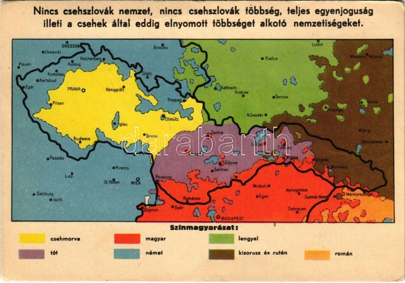 Nincs csehszlovák nemzet, nincs csehszlovák többség, teljes egyenjogúság illeti a csehek által eddig elnyomott többséget alkotó nemzetiségeket. A Magyar Nemzeti Szövetség kiadása / Hungarian Anti-Czechoslovak propaganda, irredenta map (EK)