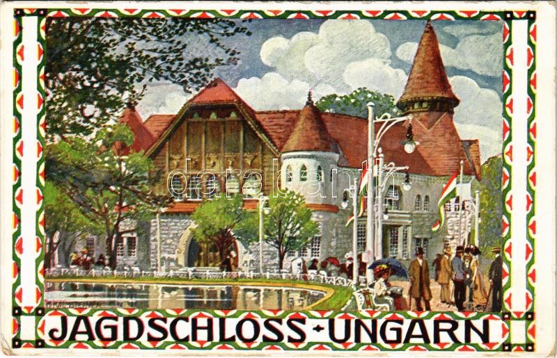 1910 Wien, Erste Internationale Jagdausstellung. Jagdschloss Ungarn / Magyar vadászkastély / The First International Hunting Exposition in Vienna, Hungarian hunting castle. Advertisement art postcard s: H. Kalmsteiner