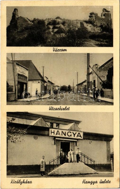 Királyháza, Korolevo, Královo nad Tisou; várrom, utca, Klein Miksa órás üzlete, Kárpátaljai Hangya szövetkezet üzlete és saját kiadása / castle ruins, street view, cooperative shop