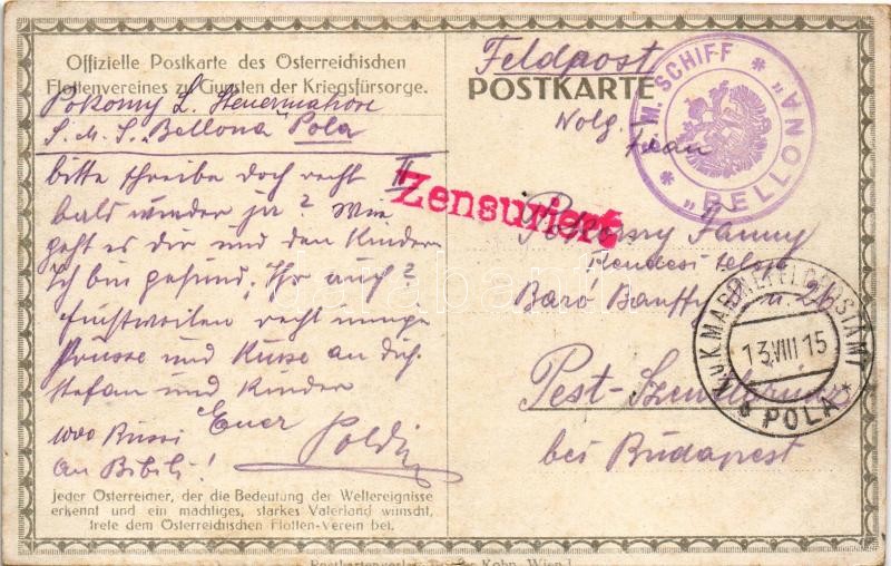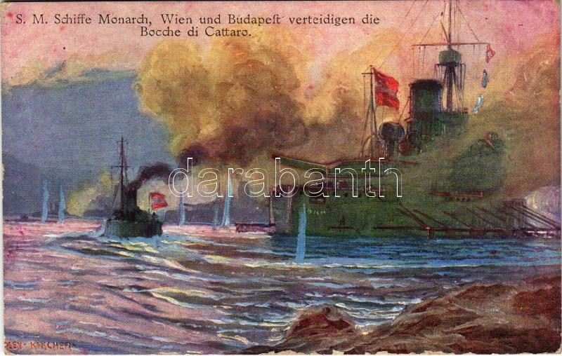 1915 SM Schiffe Monarch, Wien und Budapest verteidigen die Bocche di Cattaro. Offizielle Postkarte des Österreichischen Flottenvereines zu Gunsten der Kriegsfürsorge / WWI Austro-Hungarian Navy, K.u.K. Kriegsmarine art postcard, Monarch-class coastal defense ships defending the Bay of Kotor s: Alex Kircher + "SM SCHIFF BELLONA" (EK)
