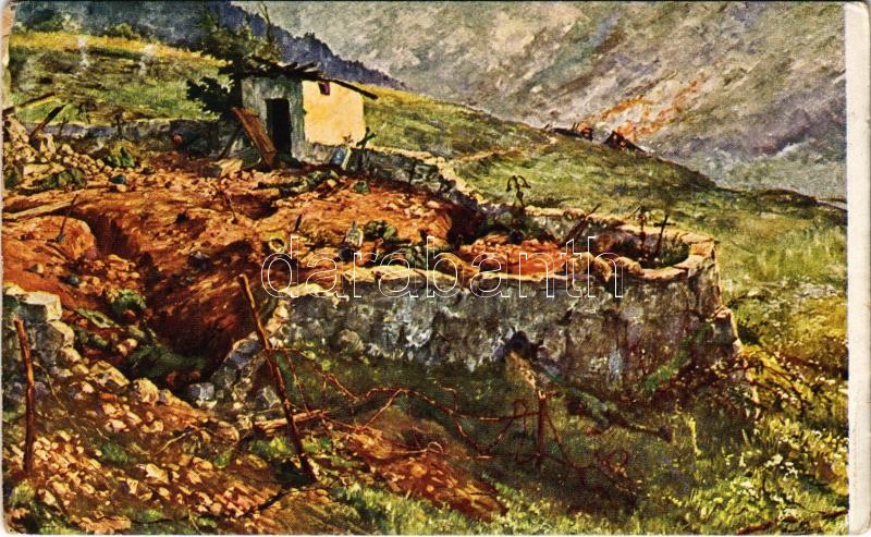 Friedhof von Chiesa (Vallarsatal) nach der Beschießung durch unsere Artillerie am 10. Juni 1916. Offizielle Karte für Witwen- und Waisenfond der Kaiserschützen / WWI Austro-Hungarian K.u.K. military art postcard, cemetery after artillery attack (szakadás / tear)