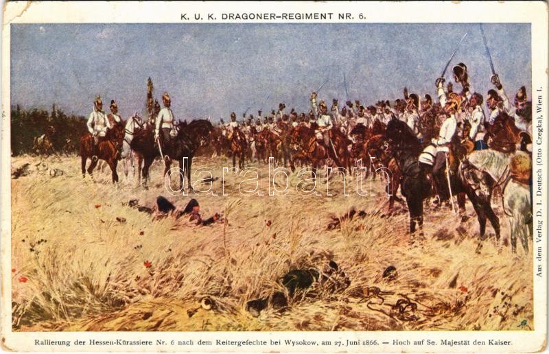 K.u.K. Dragoner-Regiment Nr. 6. Rallierung der Hessen-Kürassiere Nr. 6. nach dem Reitergefechte bei Wysokow am 27. Juni 1866. Hoch auf Se. Majestät den Kaiser / Austro-Hungarian K.u.K. military art postcard (Rb)