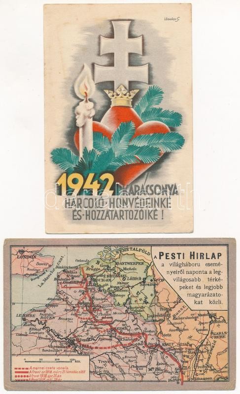 Beschreibung: 2 db RÉGI katonai képeslap: Pesti Hírlap marnei csata vonala térkép, 1942 Karácsony Légrády S. rajzával