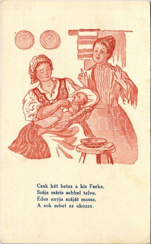 Csak két hetes a kis Ferke, szája máris sebbel telve... Kiadja az Országos Stefánia Szövetség az anyák és csecsemők védelmére / Hungarian propaganda postcard, Mother and child protective movement (EK)
