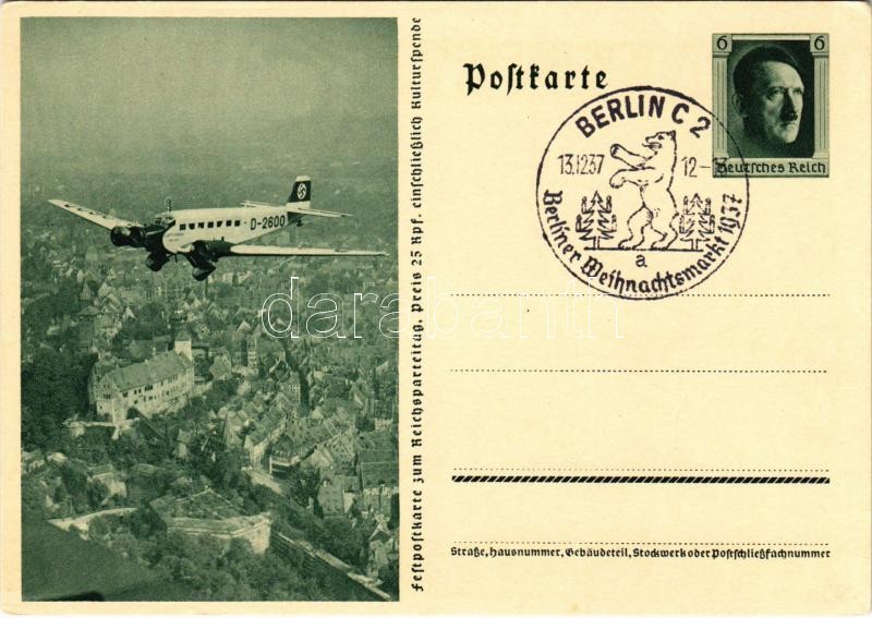 Festpostkarte zum Reichsparteitag / NSDAP German Nazi Party propaganda, Junkers Ju-52 (D-2600) Adolf Hitler's first personal transport aircraft, swastika; 6 Ga. + "Berliner Weihnachtsmarkt 1937" So. Stpl. (EK)