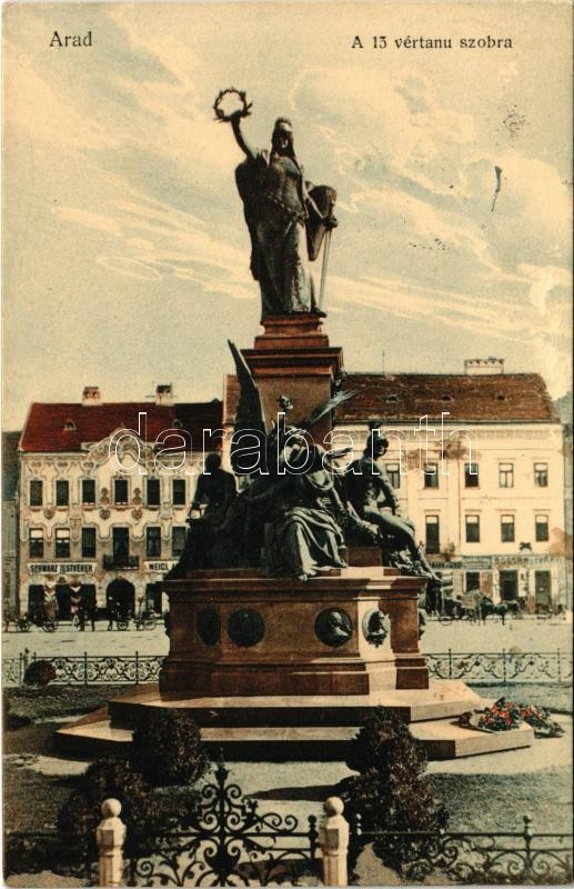 1915 Arad, A 13 vértanú szobra, Schwarz Testvérek, Weigl és Bogsán és ... https://www.darabanth.com/de/419-Fernauktion/419.0/Ansichtskarten/Siebenburgen~1500006/1915-Arad-A-13-vertanu-szobra-Schwarz-Testverek-Weigl-es-Bogsan-es-Ivanyi-uzlete-Pichler~II2645642