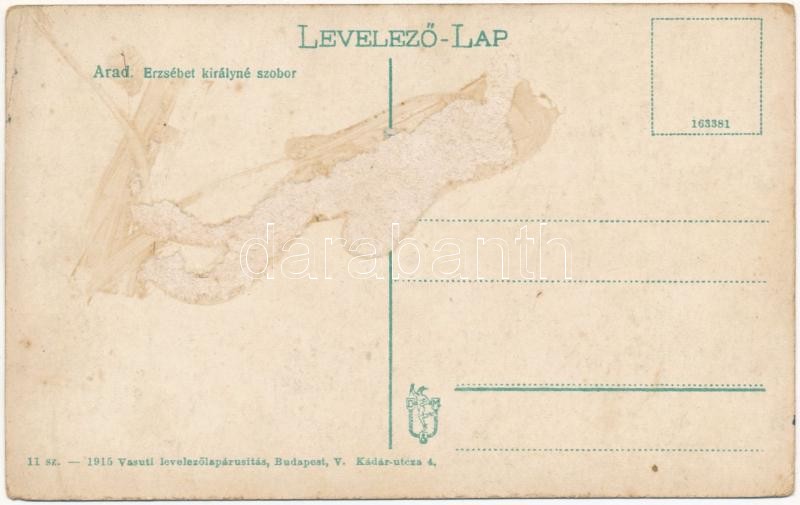Arad, Erzsébet királyné (Sissi) szobor. Vasúti levelezőlapárusítás 11.... https://www.darabanth.com/de/419-Fernauktion/419.0/Ansichtskarten/Siebenburgen~1500006/Arad-Erzsebet-kiralyne-Sissi-szobor-Vasuti-levelezolaparusitas-11-sz-1915-monument-~II2643804