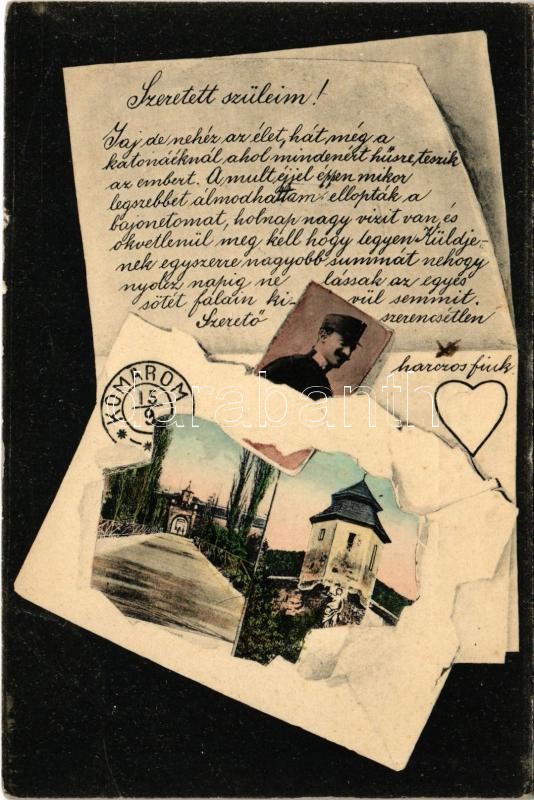 1909 Komárom, Komárno; Várkapu. Spitzer Sándor kiadása. Montázs osztrák-magyar katonával és levéllel / castle gate. Montage with K.u.K. soldier and letter (EB)