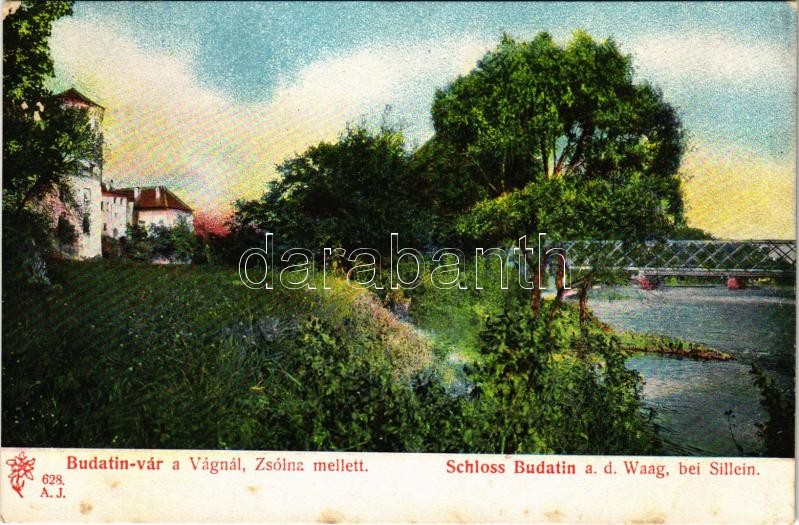 Zsolna, Zilina; Hrad Budatín / Budatin vára a Vágnál, híd. Feitzinger Ede 1904/14. 628. A.J. / Schloss Budatin a. d. Waag bei Sillein / castle, Váh river, bridge (fl)