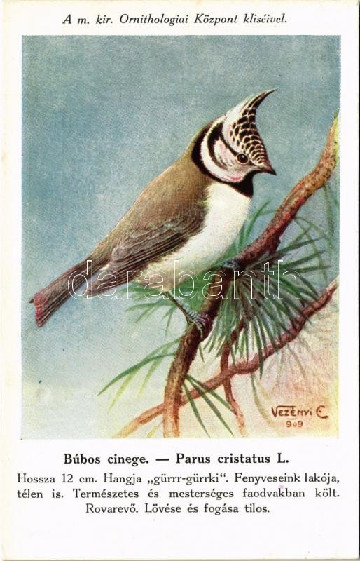 Búbos cinege. A m. kir. Ornitológiai Központ kliséivel. Magyar Földrajzi Intézet rt. kiadása. Székesfővárosi állatkerti sorozat 2. sz. / Parus cristatus L. Hungarian birds series. s: Vezényi (gyűrődés / crease)