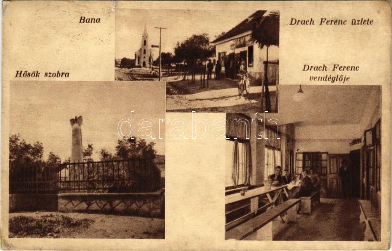 1938 Bana (Komárom), Hősök szobra, Drach Ferenc üzlete és vendéglője, ... https://www.darabanth.com/de/419-Fernauktion/419.0/Ansichtskarten/Ungarn~1500005/1938-Bana-Komarom-Hosok-szobra-Drach-Ferenc-uzlete-es-vendegloje-belso-r~II2650104