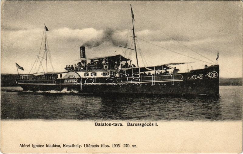 Balaton, Baross gőzös a tavon. Mérei Ignác 1905. 270. https://www.darabanth.com/de/419-Fernauktion/419.0/Ansichtskarten/Ungarn~1500005/Balaton-Baross-gozos-a-tavon-Merei-Ignac-1905-270~II2649016