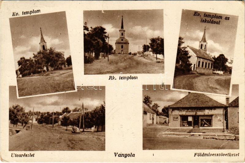 Vanyola, Evangélikus templom és iskola, római katolikus templom, utca,... https://www.darabanth.com/de/419-Fernauktion/419.0/Ansichtskarten/Ungarn~1500005/Vanyola-Evangelikus-templom-es-iskola-romai-katolikus-templom-utca-foldmivesszovetkezet-u~II2645631