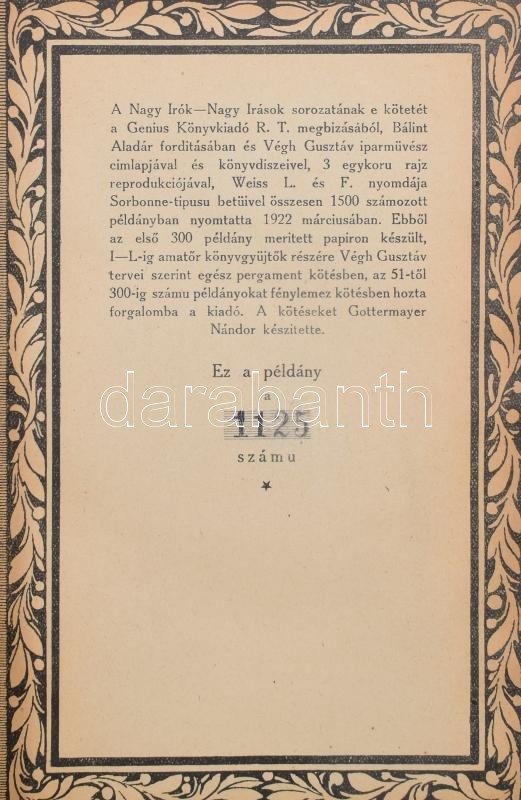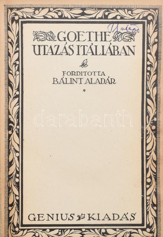 Goethe, Johann Wolfgang von: Utazás Itáliában. Ford.: Bálint Aladár. Nagy Írók - Nagy Írások. VIII. Bp., 1933., Genius. A címlap és a könyvdíszek Végh Gusztáv munkái. 3 egészoldalas illusztrációkkal. Kiadói egészvászon-kötés, foltos, sérült gerinccel, kopott borítóval. Számozott (1125/1500.) példány.