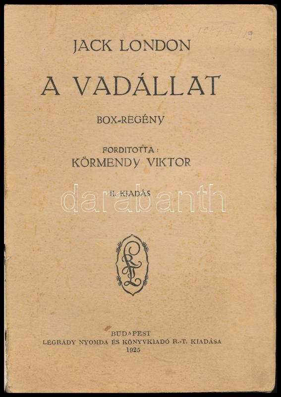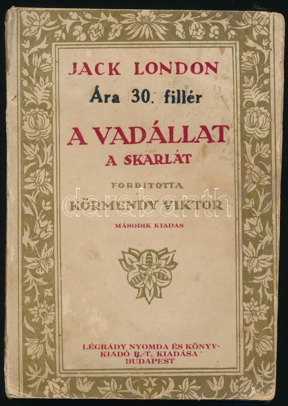 Jack London: A vadállat; A skarlát. (Egy kötetben). Ford.: Körmendy Viktor. Bp., 1925, Légrády. Második kiadás. Kiadói papírkötés, kissé viseltes állapotban, sérült borítóval, helyenként kissé foltos.