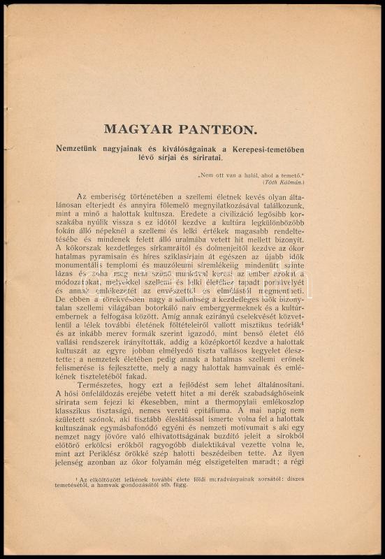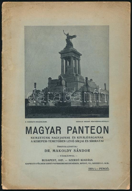 Magyar panteon. Nemzetünk nagyjainak és kiválóságainak a Kerepesi-temetőben lévő sírjai és síriratai. Összeáll.: Dr. Makoldy Sándor. Bp., 1927, a szerző kiadása (Élet-ny.), 37 p. Kiadói papírkötés, sérült, kissé foltos borítóval.