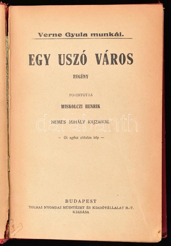 Verne Gyula: Egy uszó város; A zártörők. (Egy kötetben). Ford.: Miskolczi Henrik. Nemes Mihály és Geiger Richard rajzaival. Verne Gyula munkái. Bp., é.n., Tolnai, 170+(1) p. Oldalszámozáson belüli fekete-fehér képtáblákkal. Kiadói aranyozott, festett egészvászon-kötés, sérült borítóval, néhány kissé sérült lappal.